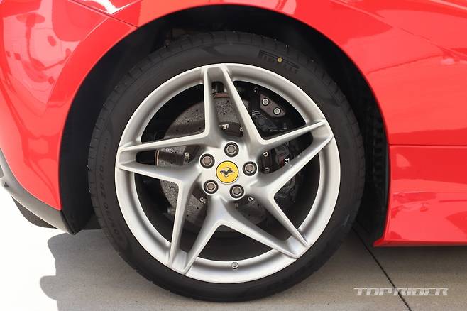 특히 보닛에는 마주 오는 바람이 통과하며 차체를 눌러줄 수 있는 에어홀이 뚫려 있다. 측면 라인은 군더더기 없이 매끈하다. 큼지막한 리어 스포일러가 있을 법도 한 차량이지만 페라리는 아름다움을 위해 스포일러 대신 다양한 기술을 적용해 다운포스를 향상시켰다.