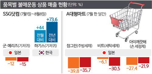 맥주와 의류 브랜드에서 시작된 일본 제품 불매운동은 육아용품과 생활용품으로 번지고 있다. 11일 SSG닷컴에 따르면 7월 1일부터 8월 8일까지 ‘군’, ‘메리즈’ 같은 대표적인 일본 브랜드 기저귀 매출이 전월 같은 기간 대비 12, 전년 대비 15 감소했다.