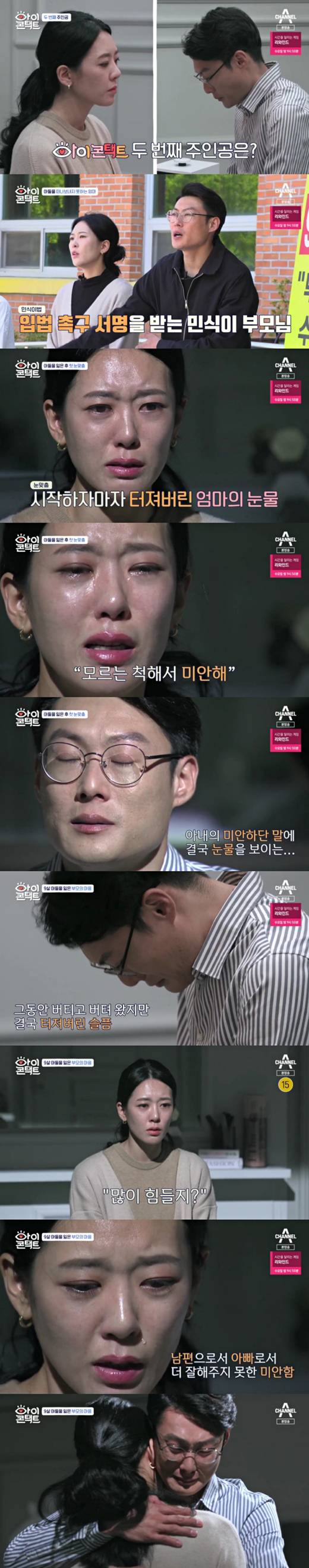 마침내 눈맞춤방에서 마주한 부부는 떠나간 아이를 떠올리며 한없이 눈물을 흘렸다. 민식이 어머니는 “나만 힘든 것 아닌데, 모른 척 해서 미안해”라며 흐느꼈고, 민식이 아버지는 ”많이 힘들지? 오빠가 너무 미안하다. 내가 좀 더 잘났으면 네가 그렇게 힘들게 일 안 했고, 그럼 민식이도 그렇게 허망하게 안 갔을 텐데…”라고 애끓는 마음을 전했다. 민식이 어머니는 “내일이 49재인데, 아직 민식이를 보낼 준비가 안 됐어. 엄마 아빠 보고 싶다고, 무섭다고 기다릴 것 같아”라며 울었다.