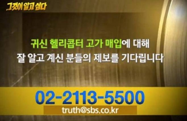 20일 방송된 SBS '그것이 알고싶다'에서는 방송 말미 "귀신 헬리콥터 고가 매입에 대해 잘 알고 계신 분들의 제보를 기다립니다"는 내용의 요청이 담겼다.