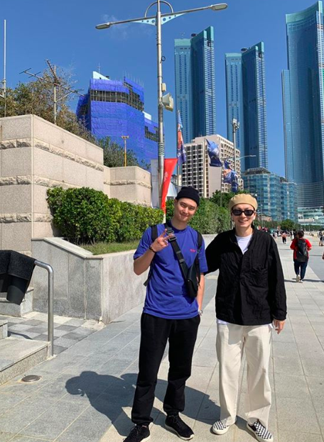 그가 공개한 사진을 보면 고경표와 이동휘가 부산 해운대 해수욕장으로 향하는 도보 위에 나란히 서 있다.
