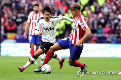 epa07934025 Atletico Madrid's Marcos Llorente (R) vies for the ball with Valencia's Korean player Kang-In Lee (L) during the Spanish LaLiga soccer match held between Atletico Madrid and Valencia FC at Wanda Metropolitano Stadium in Madrid, Spain, 19 October 2019. EPA/JUANJO MARTIN