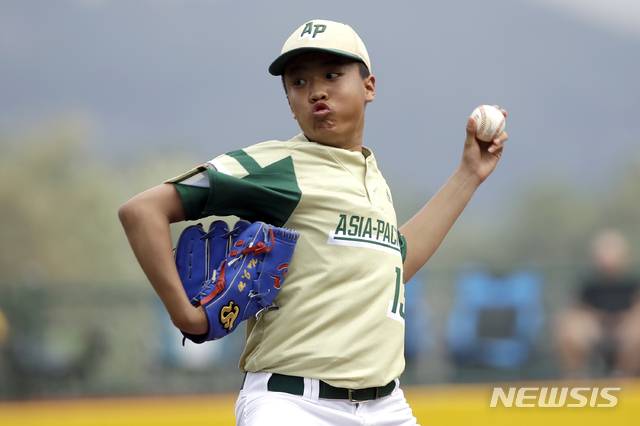 【윌리엄스포트=AP/뉴시스】리틀야구 한국대표팀 투수 나진원이 16일(현지시간) 미 펜실베니아주 윌리암스포트 볼룬티어 야구장에서 열린 ‘2019 리틀리그 월드시리즈’ 첫날 베네수엘라와의 경기에서 투구하고 있다.