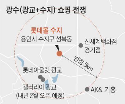 유통가에선 반경 5㎞ 이내를 '1차 상권'이라 부르는데, 여기서 매장 매출의 60% 이상이 나온다고 보고 있다. 롯데몰 수지점 반경 5㎞ 안팎에는 신세계백화점 경기점, 롯데아울렛 광교점, AK& 기흥점 등이 자리 잡고 있다. 이마트 4개와 롯데마트도 영업 중이다. 여기에 약 5000억원을 투입해 '세계에서 가장 아름다운 백화점'이란 모토로 문을 여는 갤러리아 광교점까지 들어서게 되면, 이 지역 상권의 경쟁은 최고조에 달할 것으로 보인다. 갤러리아백화점 관계자는 "광교점이 '제2의 명품관(서울 압구정동)'이 될 것"이라며 "기대가 큰 이 지역에 명품 브랜드와 프리미엄 식당 등을 총집결할 계획"이라고 말했다.