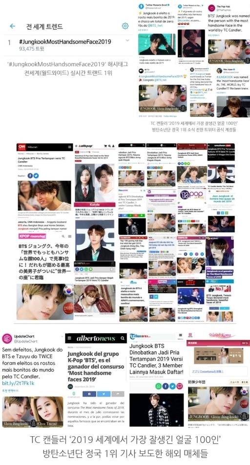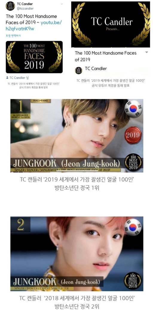 美 TC 캔들러, 방탄소년단 정국 '2019 세계 미남얼굴' 1위.."월드 실트 축하 쏟아져"