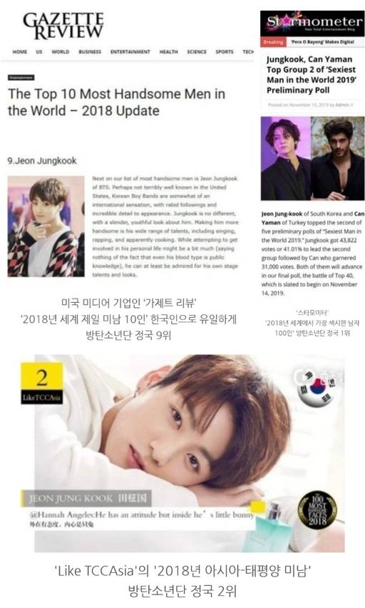 방탄소년단 정국은 TC 캔들러 외에도 미국 미디어 기업인 ‘가제트 리뷰’에서 2018년을 결산하며 스포츠, TV 프로그램 등 다양한 분야에서 톱 10인을 선정했고 이 중 ‘2018년 세계 제일 미남 10인’에 방탄소년단 정국이 9위로 이름을 올렸다.
