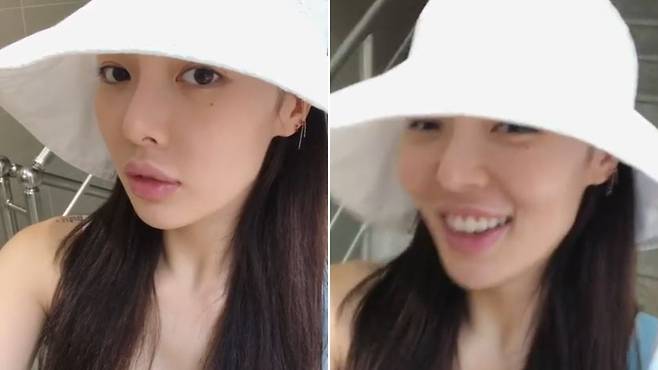 공개된 영상 속 길게 늘어뜨린 생머리에 하얀색 모자를 쓴 현아는 화장기 없는 수수한 모습으로 청순한 분위기를 뽐냈습니다.