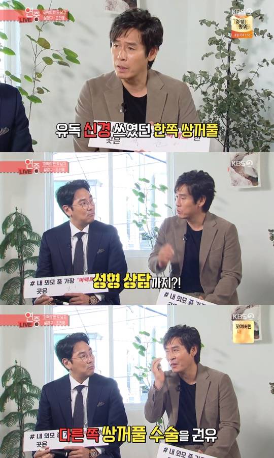 설경구는 "한쪽 눈에 생긴 쌍꺼풀 때문에 스트레스를 너무 받아서 성형 상담까지 받았다. 그런데 오히려 다른 한 쪽 눈까지 쌍꺼풀 수술을 해야 한다고 하더라. 얼굴이 망가질까 봐 안 했다. 그동안 짝눈 때문에 스트레스를 많이 받았는데 이젠 장점으로 생각해보려고 한다"고 털어놨다.