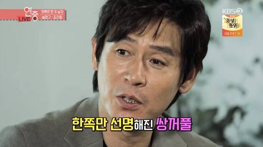 설경구는 “한쪽 눈에 생긴 쌍꺼풀 때문에 스트레스를 너무 받아서 성형 상담까지 받았다. 그런데 오히려 다른 한 쪽 눈까지 쌍꺼풀 수술을 해야 한다고 하더라. 얼굴이 망가질까 봐 안 했다. 그동안 짝눈 때문에 스트레스를 많이 받았는데 이젠 장점으로 생각해보려고 한다”고 털어놨다. (사진=KBS 2TV ‘연예가중계’ 캡처)
