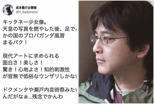 사다모토(사진 오른쪽)는 지난 9일 자신의 트위터에 “더러운 소녀상. (중략)현대 예술에게 요구되는 재미! 아름다움! 놀라움! 즐거움! 지적자극성이 전무한 천박한 넌더리밖에 없다”는 등 글을 올려 평화의 소녀상과 이 소녀상을 전시했다가 중단해 물의를 일으킨 일본 ‘아이치 트리엔날레’를 대놓고 비판했다.
