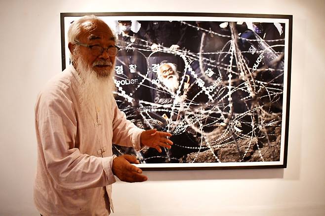 | ▲ 노순택 작가가 찍은 자신의 사진에 대해 이야기하는 문정현 신부. |