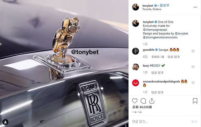 이번에 드레이크가 공을 들인 모델은 바로 롤스로이스 팬텀이다. 하지만 단순한 팬텀이 아닌 다이아몬드로 덮여 있는 후드와 커스텀 금빛 부엉이로 장식된 특별한 자동차다.