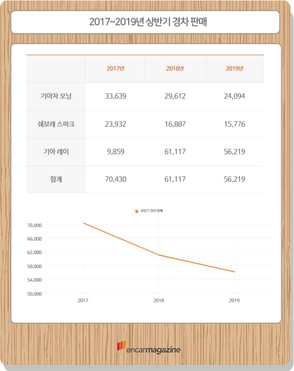 2019년 상반기 경차 시장은 어땠을까? 총 5만6,219대 팔렸다. 지난해 같은 기간 6만1,117대와 비교하면 8% 줄었다. 경차 시장의 위축은 단기적인 현상이 아니다. 지난 2017년에는 상반기에만 7만430대를 기록했다. 올해와 비교하면 1만4,211대가 더 팔렸고, 이때의 감소폭은 20%를 넘는다.