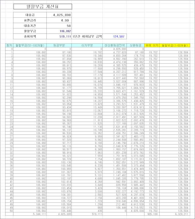 차값의 50%인 482만5,000원을 원리금 균등 상환 방식으로 계산하면 월 10만6,882원이다. 여기에 유예한 원금의 월 이자 1만9,702원을 더하면, 한 달에 내야 하는 할부금은 12만6,584원이다. 51개월차부터는 유예이자가 없어 10만6,882원만 내면 된다. 그렇다면 원금과 이자를 더한 전체 차값은 얼마일까?