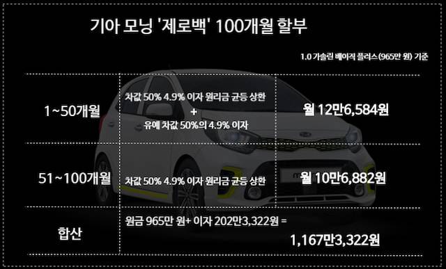 기아차는 초장기 구매 프로그램 '제로백'을 내세웠다. 이걸 쓰면 모닝을 100개월 할부로 살 수 있다. 50개월까지는 차값의 반만 할부로 낸다. 나머지 차값의 반은 이자만 낸다. 51개월차부터는 남은 차값의 반을 원리금 균등 상환 방식으로 지불한다. 이자는 4.9%로 동일하다. 알기 쉽게 965만 원짜리 모닝(1.0 가솔린 베이직 플러스)을 기준으로 계산해 보자.
