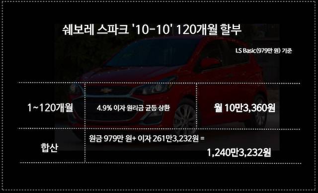 쉐보레는 스파크의 10년(120개월) 초장기 프로모션을 내세웠다. 명칭은 ’10-10 슈퍼 초장기 할부’ 프로그램. 이자는 4.9%로 선수율과 관계없이 고정된다. 스파크 LS Basic(979만 원)을 구입하면 한 달 할부금이 10만 원대 초반이다. 좀 더 상세히 살펴보자.
