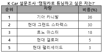 그 결과 전체 응답자 중 36%가 캠핑카로 튜닝하고 싶은 차로 카니발을 뽑았다.