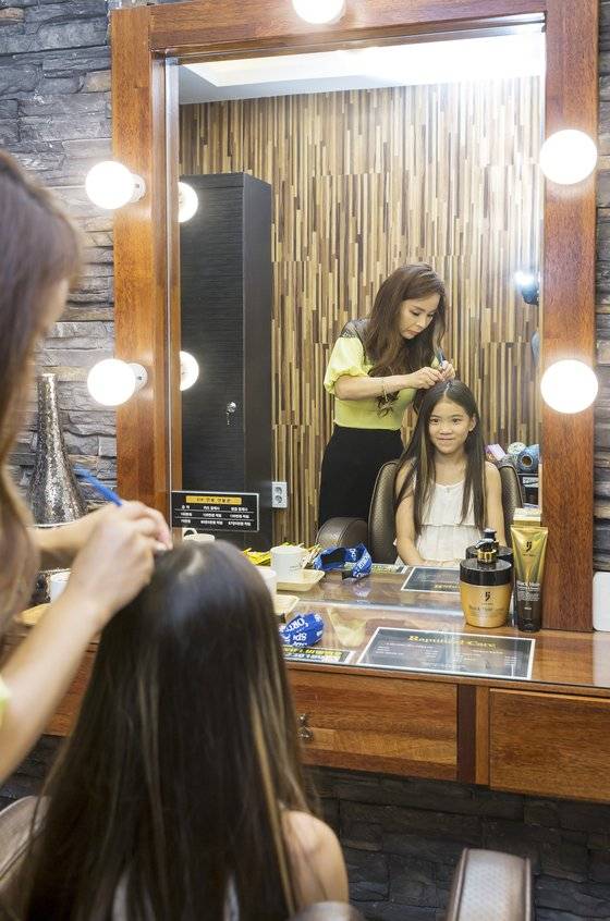 소중 학생기자단이 헤어 스타일링 변신에 나섰다. (왼쪽부터) 블레이즈를 시술한 유지안 학생모델, 트윙클을 시술한 이수안 학생모델, 포인트 붙임머리를 시술한 이은채 학생기자.