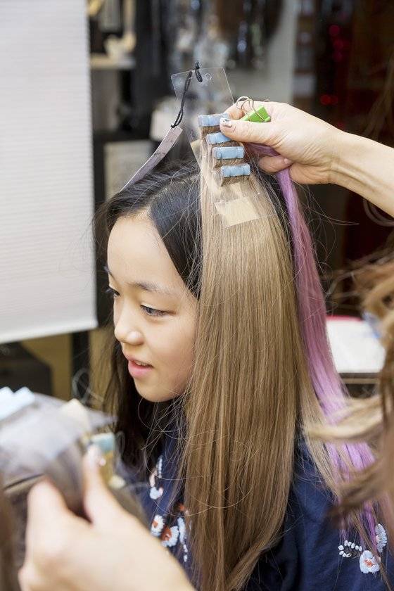 포인트 붙임머리를 위해 컬러피스를 머리카락 밑과 위에 붙여주고 있다.