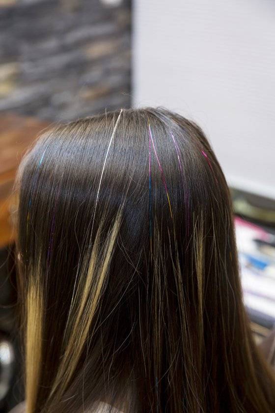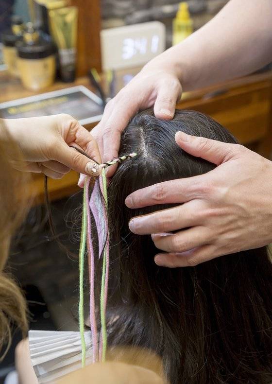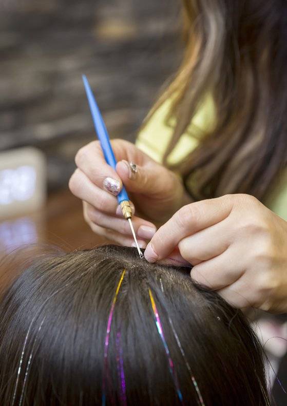 트윙클은 긴 생머리에 잘 어울린다는 세화 실장의 추천에 이수안 학생모델이 도전해보기로 했죠. 브릿지 염색머리가 인상적인 수안 학생이 핫핑크·실버 등 원하는 색깔을 고르자 본격적인 시술에 들어갑니다. 트윙클 한 가닥을 반으로 접어 원을 만든 후 머리에 걸어줘야 해요. 정교하게 하기 위해 일명 코바늘로 불리는 스킬바늘로 매듭을 묶어주죠. 트윙클 가닥마다 어느 정도 간격을 주면 머리카락 군데군데 트윙클이 보이면서 자연스럽고 세련되게 연출됩니다. 그다음 머리 기장에 맞춰 트윙클을 잘라주면 완성! 보통 미용실에서 시술을 받으면 7가닥에 1만원 정도의 비용이 든다고 해요. 이수안 학생은 14가닥 정도를 시술해 최대한 포인트가 될 수 있게 연출했죠. 바람에 흩날리거나 조명이 비치면 머리칼 사이로 ‘반짝’ 하고 빛나는 트윙클 덕분에 무대 위의 주인공이 된 기분입니다.