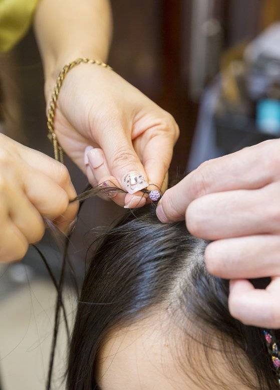 머리카락과 실을 같이 땋는 얀 블레이즈 시술을 하는 모습.
