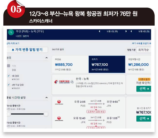 사실 이건 운이 좀 없는 경우입니다. 날짜만 잘 고르면 스카이스캐너에서는 몇몇 날짜에서 50만 원대 중후반에 1회 경유 부산-뉴욕 왕복 항공권을 찾을 수 있거든요.