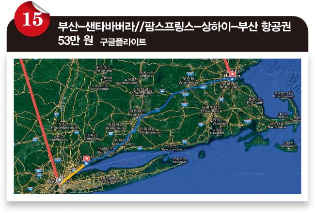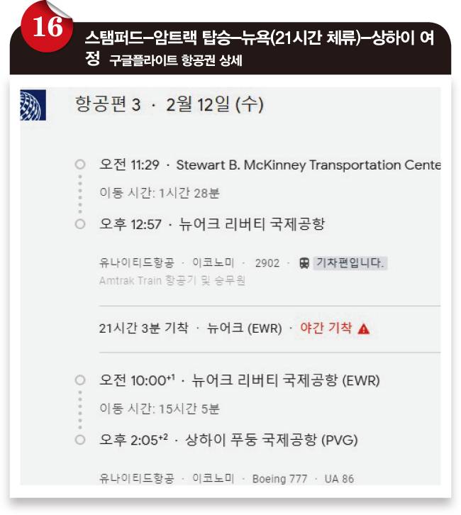 ⓯ ⓰ 스탬퍼드는 뉴욕에서 약 50마일 떨어진 코네티컷주의 도시로, 금융업이 발달한 미국 내 '최고 부자' 동네 가운데 하나입니다. 스탬퍼드에서 아웃해 뉴욕을 경유한 뒤 상하이로 가는데, 스탬퍼드 → 뉴욕 구간은 기차(암트랙)를 탑승합니다. 뉴욕에서 출발하기 하루 전 기차를 타고 뉴욕으로 가는 스케줄로, 결국 뉴욕에서 아웃하는 항공권인 셈입니다. 이렇게 항공권에 기차가 포함되는 경우가 종종 있습니다. 가격비교 사이트가 대부분 검색하지 못할 뿐입니다.