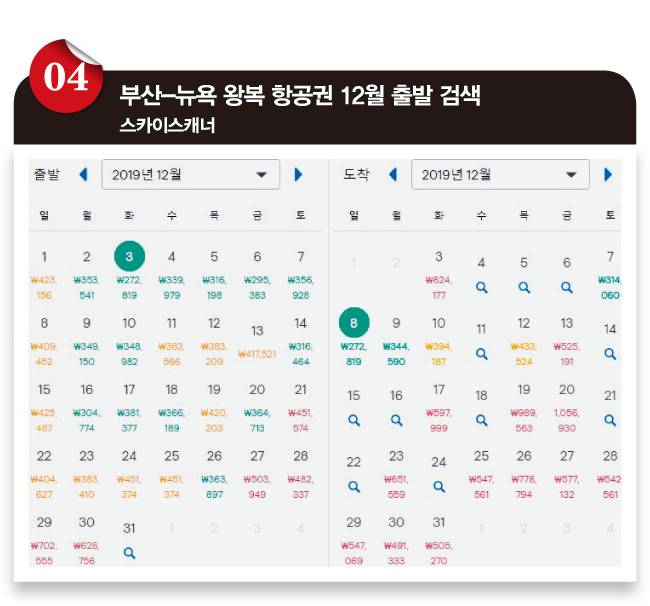 ❹ 부산 출발 날짜는 12월 3일이 가장 싸고, 뉴욕에서 돌아오는 날짜는 12월 8일이 가장 저렴해 54만 원입니다. 물론 이 가격은 최근 8일 내 검색 결과일 뿐입니다. 그동안 가격이 달라졌을 개연성이 꽤 있습니다.