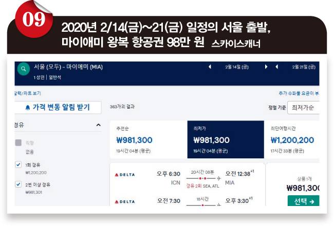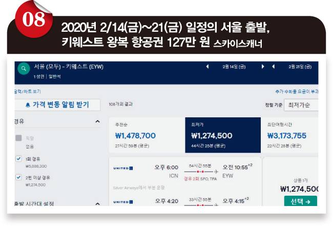 ❾ 키웨스트에서 차로 4시간 거리에 마이애미가 있습니다. 부산을 서울로 바꾼 것처럼 키웨스트도 마이애미로 바꿔 검색하면 더 싼 항공권이 나올 개연성이 꽤 높거든요. 부산-서울 구간을 KTX나 리무진으로 해결하듯이, 키웨스트-마이애미 구간도 어떻게든 해결할 수 있을 테니까요. 역시 같은 2020년 2/14(금)~21(금) 일정으로 98만 원에 스케줄까지 그럭저럭 괜찮은 항공권이 검색됩니다. 여기까지가 일반적으로 생각해볼 수 있는 방법입니다. 더 해본다면 다른 사이트에서 검색하거나 하루 이틀 날짜를 바꿔가며 찾아보는 것 정도죠.