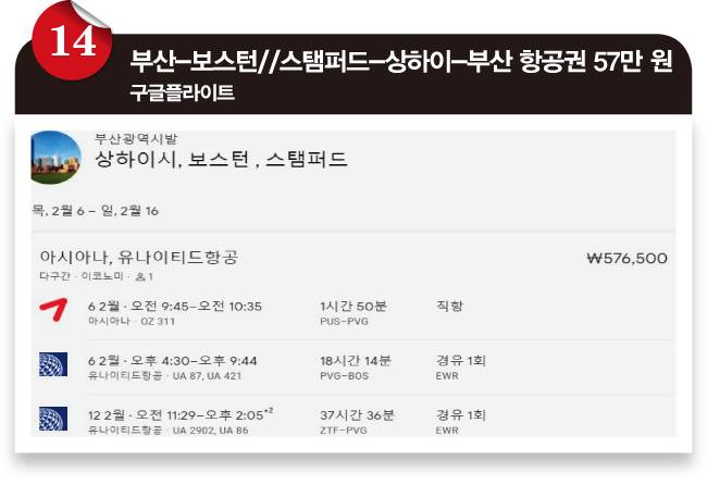 ⓫ 출국 여정에서 상하이와 뉴욕에 머무는 시간을 일부러 더 길게 잡은 항공권입니다. 단순 경유에서 잠깐이라도 경유지를 여행할 수 있는 여정으로 바꾼 거죠. 귀국 여정은 마이애미에서 출발합니다. 마이애미가 훨씬 큰 도시라 그런지 연결 스케줄이 괜찮습니다. 여정의 끝에는 다시 상하이에 며칠 머물다 돌아옵니다. 참고로 이 항공권은 출국 여정과 귀국 여정 모두 상하이에 무비자로 갈 수 있습니다.