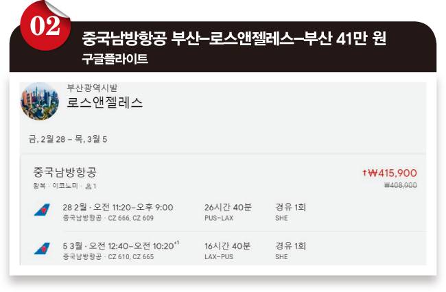 ❷ 사실 로스앤젤레스는 더 싼 항공권이 존재합니다. 중국남방항공의 선양 1회 경유 항공권이 왕복 41만 원입니다. 1회 경유라 어렵지 않게 싼 항공권을 검색할 수 있었던 겁니다. 로스앤젤레스를 제외하면 싼 가격이 눈에 띄지 않습니다. 뉴욕도 최저가가 75만 원으로 표시돼 있네요.