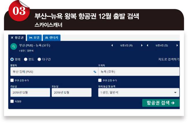 ❸ 스카이스캐너에서 뉴욕 항공권을 검색해봅니다. 12월 출발로 가장 싼 항공권을 찾기 위해 최저가 달력을 띄워봅니다.