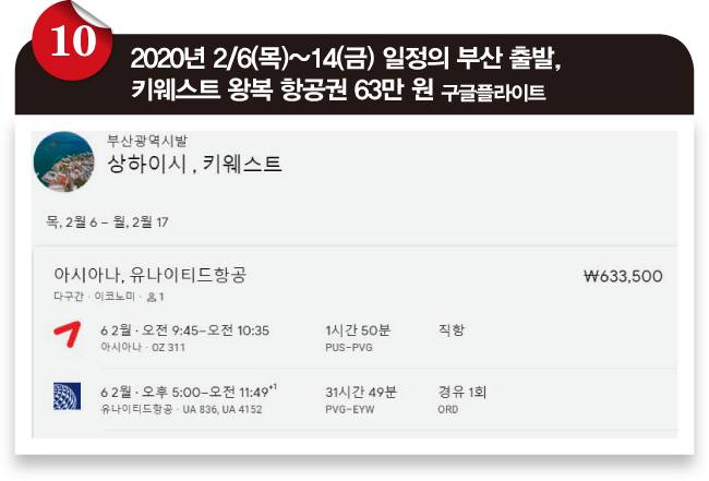 ❿ 그런데 다른 방법도 있습니다. 63만 원이면 부산에서 키웨스트를 왕복할 수 있습니다. 가격도 싸지만 별도의 부산-서울 이동과 키웨스트-마이애미 이동도 필요 없죠. 단지 일반적인 방법으로는 쉽게 검색되지 않아 그 존재를 몰랐을 뿐입니다. 이 항공권은 길을 알려주려고 일부러 다구간 검색이 가능하도록 해놓았습니다. '부산 → 키웨스트'를 '부산 → 상하이'와 '상하이 → 키웨스트'로 나눈 것으로, 강제로 상하이를 경유하는 항공권을 검색하도록 유도하는 방법입니다. 한 가지 단점은 경유 스케줄인데요. 상하이와 미국 내 경유지인 뉴욕(뉴어크리버티국제공항(EWR))에서 긴 대기 시간이 단점입니다. 이를 해결하는 방법은 경유지에 머무는 시간을 조정해 경유지도 여행하는 겁니다.