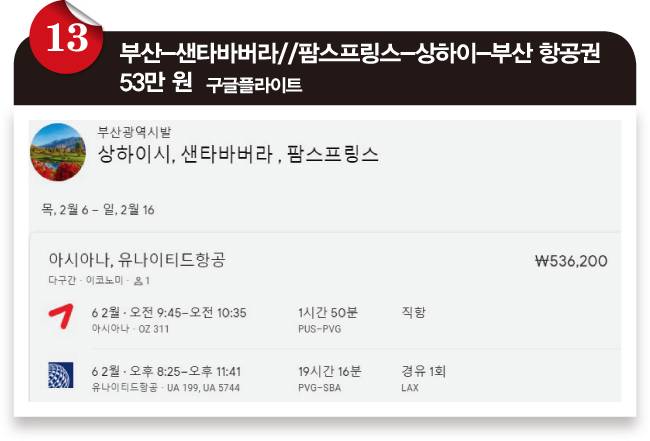 ⓭ 로스앤젤레스 북쪽 샌타바버라와 남쪽 팜스프링스를 다른 여정으로 다녀오는 항공권입니다. 샌타바버라나 팜스프링스 모두 작은 도시지만 싼 가격에 다녀올 수 있습니다. 로스앤젤레스를 비롯해 그 주변 상당수 도시는 유사한 여정으로 최저가 53만 원가량의 항공권을 검색할 수 있습니다.