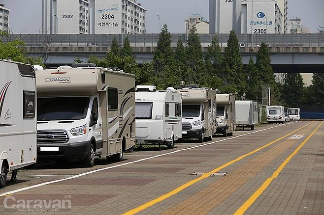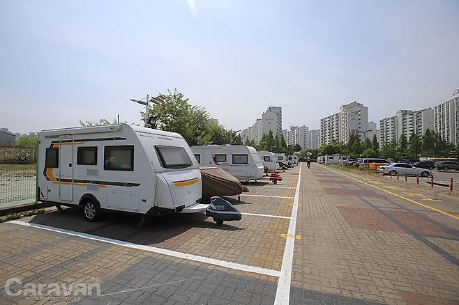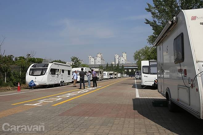 하지만 5월 1일 본격적인 캠핑카(카라반)전용 주차장 시행과 더불어 이런 문제는 말끔히 정리된 듯 하다. 기존의 주차 구획선 안에 제대로 세우기 힘들었던 캠핑카, 카라반을 위해 길이 7미터, 폭 3미터의 소형 주차장(월 6만원) 34면이 조성되었고 취재를 위해 방문했던 5월 15일 주차 라인 안에 정확히 주차, 정리된 모습에 많은 것을 느낄 수 있었다.