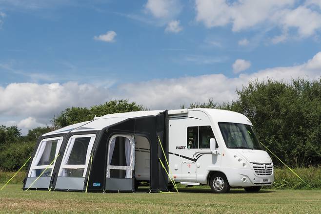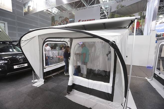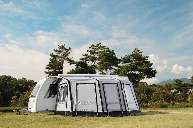 최근 알빙 시장에서 캠핑카의 수요가 높아지면서 특화된 제품이 나오고 있다. 높이가 다소 높은 모터홈 전용 에어텐트로 측면에 에어빔이 추가로 부착되어 텐트를 분리하여도 자립할 수 있는 구성이다. 세팅 후 모터홈, 캠핑카를 따로 분리하여 여행을 이어가고 다시 부착할 수 있어 기존 텐트의 단점을 확실히 극복한 모습이다.