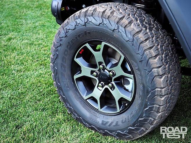 먼저 외모 소개부터. 루비콘의 차체 길이와 너비, 높이는 각각 4,855×1,895×1,880㎜. 이전보다 105㎜ 길고 15㎜ 넓으며 35㎜ 높다. 휠베이스도 3m를 가뿐히 넘긴다(3,010㎜). 한 덩치 하는 G4 렉스턴보다 너비 빼고 다 크다. 옆모습도 볼거리가 가득하다. 새롭게 장만한 17인치 휠은 안쪽에 윌리스 MB 모양의 빨간 스티커를 붙이는 등 깨알 같은 디테일도 더했다.