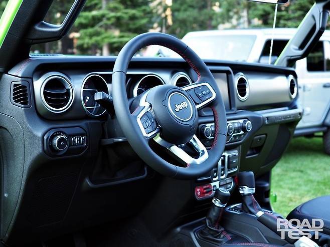 사실 기존 랭글러가 조립품질 좋기로 소문난 차는 아니었다. ‘툭툭’ 잘라 얹은 대시보드 등은 ‘미국감성’이라고 얼버무렸으니까. 반면 신형은 각 소재가 빈틈없이 정교하게 맞물렸다. 곧게 뻗은 대시보드엔 깊은 컬러의 패널을 더했고, 가죽 이음새는 빨간 실로 메우는 등 기교까지 부렸다. 각 버튼별로 누르는 방법도 조금씩 달라, 모든 조작 경험이 특별하게 다가온다. 특히 운전석에 앉으면 바짝 솟은 A필러 덕분에 장갑차에 앉은 듯한 기분도 든다.