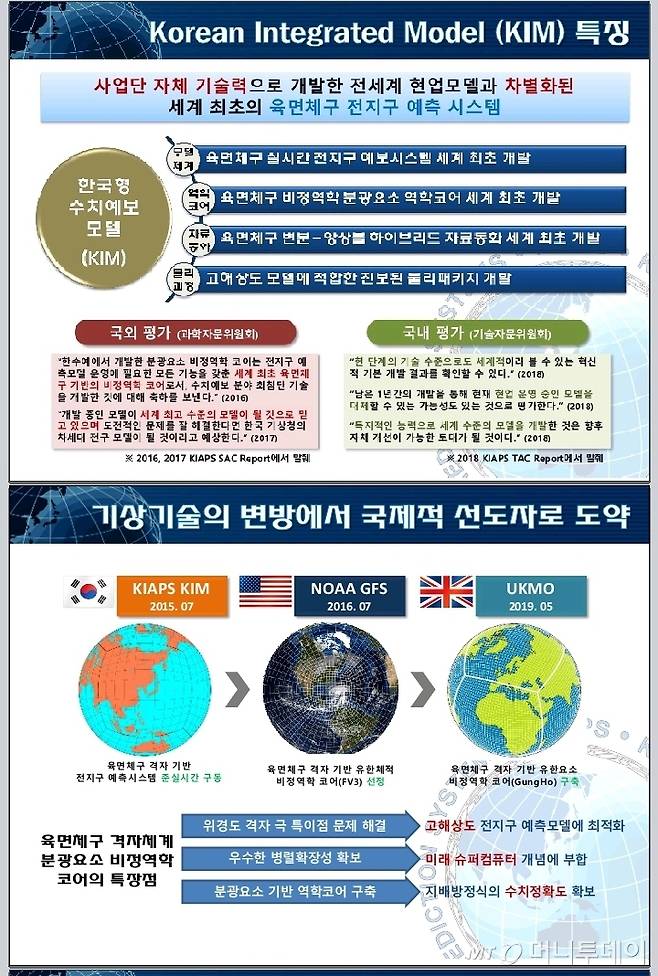 기상청은 예보정확도를 높이기 위해 2011년부터 우리나라를 포함한 동아시아 지역에 최적화된 '한국형 수치예보모델 개발'을 추진해 왔다. 미국 등 기존 모델보다 예측정확도가 높은 육면체구 격자체계를 활용해 시스템이 만들어졌다.