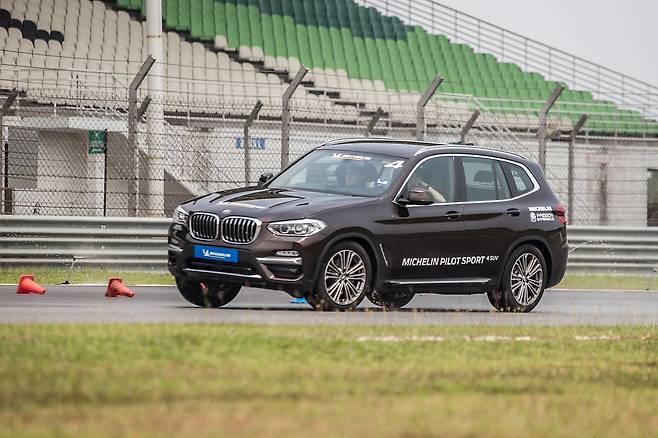 실험용 차는 BMW X3 30i, 코스는 급제동, 슬라롬, 빗길 제동, 빗길 슬라롬까지 총 네 가지다. 재밌는 사실은 빗길 주행 상황만 비교한다는 점이다. 미쉐린의 젖은 노면 실력에 대한 자신감을 엿볼 수 있다. 반면, 마른 노면에서의 비교 실험은 없었다.