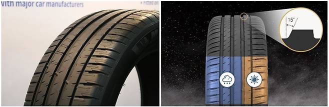 꼼수가 있다면 파일럿 스포츠 4 SUV에 들어간 독특한 기술이 아닐까. 타이어를 좌우로 나누어 안쪽은 젖은 노면에, 바깥쪽은 마른 노면에 최적화했다. 특히 안쪽은 특수 실리카와 엘라스토머(탄성적인 플라스틱 소재)를 섞어 만들어 젖은 노면을 든든히 붙든다.