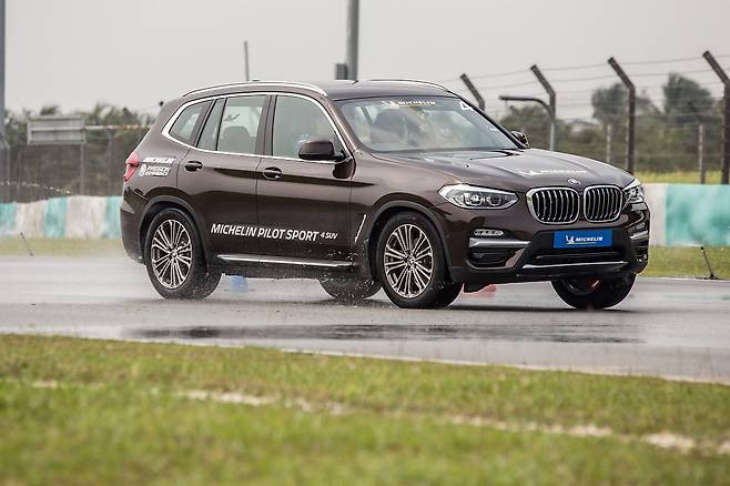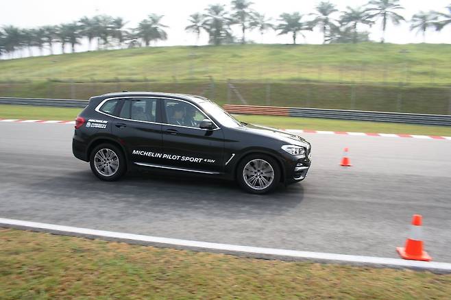 실험용 차는 BMW X3 30i, 코스는 급제동, 슬라롬, 빗길 제동, 빗길 슬라롬까지 총 네 가지다. 재밌는 사실은 빗길 주행 상황만 비교한다는 점이다. 미쉐린의 젖은 노면 실력에 대한 자신감을 엿볼 수 있다. 반면, 마른 노면에서의 비교 실험은 없었다.