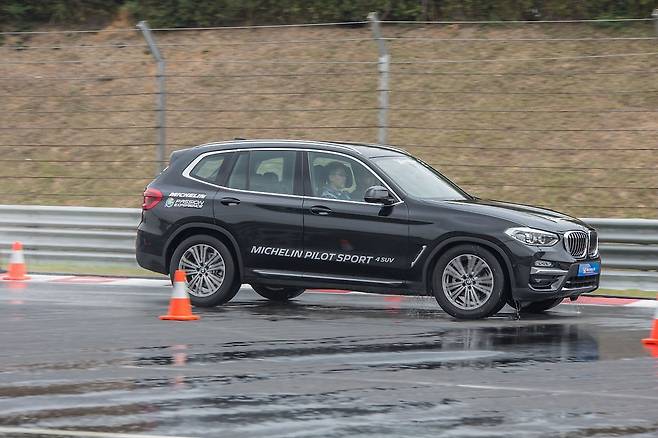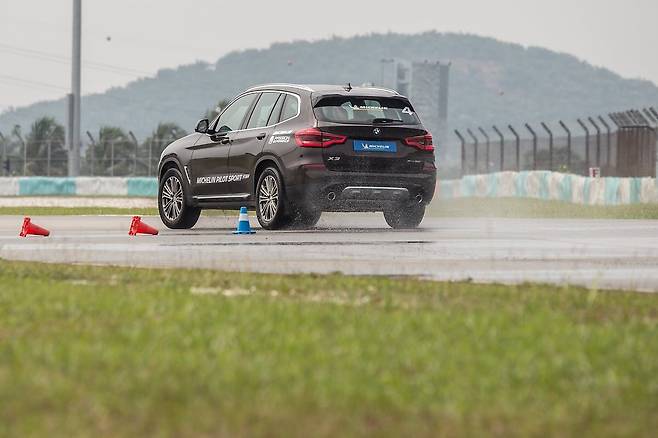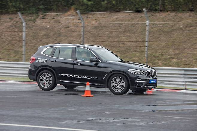 이어 미쉐린 타이어 신은 X3에 올랐다. 그런데 상황이 좀 다르다. 인스트럭터가 거만한 표정으로 속도 제한 풀더니 70㎞/h로 자유롭게 달려보란다. ‘그래 한번 달려보자.’ 훨씬 빠른 속도로 콘과 콘 사이로 진입하는데 웬걸, 미끄러짐 하나 없다. 같은 노면인데 마치 마른 노면처럼 바닥을 튼튼히 붙든다. 더 빠른 속도로 콘과 콘 사이를 헤집는데도 X3는 미끄러지지 않았다.