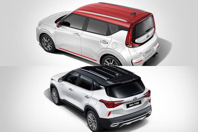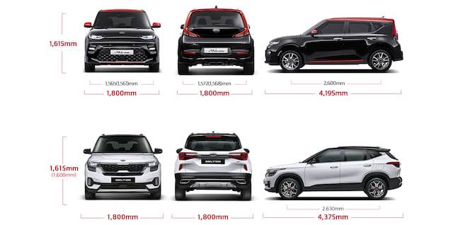 높이(1,615mm)와 너비(1,800mm)는 서로 같다. 하지만 길이는 셀토스가 근소하게나마 길다(쏘울 부스터: 4,195mm, 셀토스: 4,375mm). 육안 상 차이가 크게 느껴질 정도는 아니다. 앞뒤 바퀴 사이의 거리(휠베이스)도 셀토스가 30mm 더 길다(쏘울 부스터: 2,600mm). 트렁크 공간의 경우 쏘울 부스터는 364L, 셀토스는 498L다. 두 모델 모두 기본형부터 2열 시트 폴딩이 가능한 만큼 적재 공간을 다양하게 활용할 수 있다.