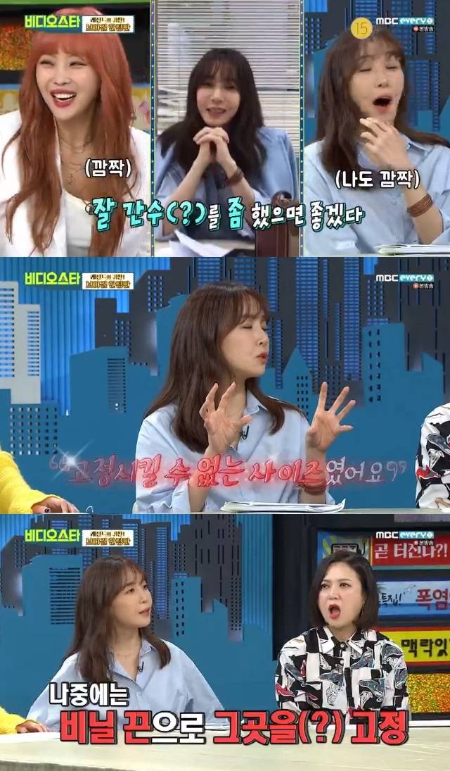 김이나는 브아걸의 스태프로도 일을 많이 해서 멤버들의 신체 특징까지 속속들이 알고 있다고. 김이나는 “내가 먹이고 입히고 했다”며 “고정시킬 수 없는 사이즈이긴 했다. 나중에 비닐 끈으로 했다. 내가 못 챙겨줄 때 흘리고 다니면 어떡하나 걱정했다”고 너스레를 떨었다. (사진=MBC에브리원 ‘비디오스타’ 캡처)
