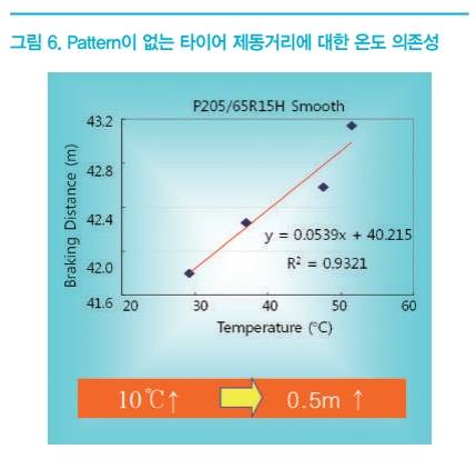 상기 두 종류의 시험 결과를 요약하면 <그림 7>에 표현된 것처럼 10℃ 온도 상승에 Smooth 타이어의 경우에는 제동거리가 0.5m 증가하고, Pattern 형상이 있는 타이어는 약 1.1m가 길어짐을 확인하였다. 이와 같이 Pattern 형상 유무에 따라 제동거리의 온도 의존성이 달라지는 이유는 타이어 트레드의 강성 차이로 인한 온도 민감도가 다르기 때문이며, 이에 대한 설명은 보다 전문적 영역이므로 본 고에서는 다루지 않기로 한다.