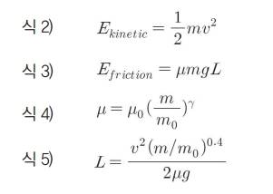 <그림 11>의 분석 결과에 따르면 피크 마찰계수는 하중에 대한 지수 함수 형태의 감소 경향을 갖는 것으로 나타났다. 일반적으로 운동하고 있는 물체는 노면과 물체의 마찰에 의하여 정지하게 되고, 정지 소요 시간 또는 이동 거리는 두 물체간의 마찰계수에 의하여 결정된다.운동에너지를 표현한 식 2)와 마찰에너지 식 3)을 이용한 에너지 평형식과 마찰계수의 하중 의존식 식 4)로부터 제동거리(L)에 대한 식 5)를 유도할 수 있었다.