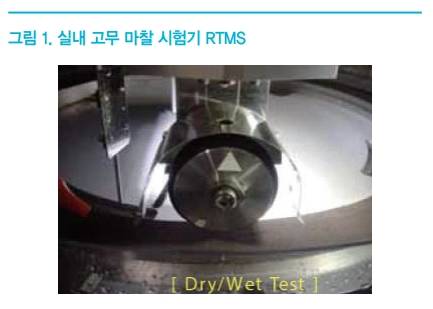 고무 마찰 시험은 <그림 1>에 표현된 당사 보유 실내 마찰시험기인 RTMS를 활용하여 진행하였다. 본 시험기는 온도, 하중 그리고 시편의 회전 속도 등을 제어할 수 있다. 노면은 흔히 실내 시험에 사용되는 120 그리드 거칠기의 사포를 이용하였다. 그리고 회전 속도는 30km/h, 하중은 실제 타이어에 가해지는 접지압과 유사 수준의 접지압을 확보할 수 있도록 70N으로 진행하였다.