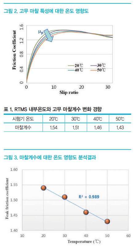 식 1)에서 와 은 노면과 시험 시편의 회전 속도를 의미한다. 시험 결과에 따르면 <표 1>과 <그림 3>에 표현된 것처럼 온도가 증가함에 따라 Peak friction coefficient