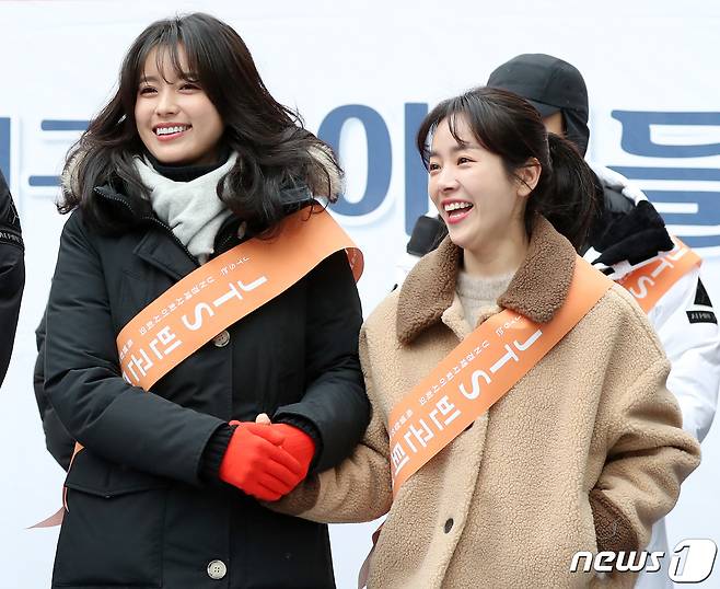 (서울=뉴스1) 김진환 기자 = 배우 한효주와 한지민(오른쪽)이 21일 오후 서울 강남역 인근 광장에서 열린 JTS 모금행사에 참석해 환하게 웃고 있다. 2019.12.21/뉴스1